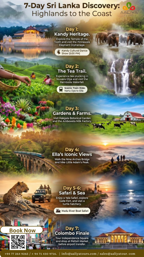 Book a 7-day Sri Lanka tour with Aaliya Tours. Explore Kandy, Nuwara Eliya, Ella, Yala, Galle, and Colombo with a private, customizable itinerary.